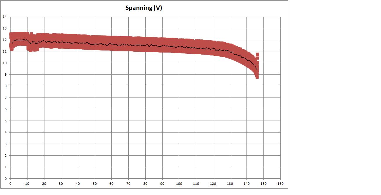 Measuring the voltage over the loaded battery as it was discharged, produced the following graph for "Accu 1". The picture clearly shows that measured voltages fluctuate around 2V for any point in time during the measurements. Some further analysis showed that this was caused by an oscillation in the Constant Current Load. Once this issue was fixed the next measurements where much cleaner.